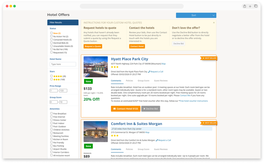 The Group RFP & Bid Response Tool is available to assist. With this solution, travelers and/or group leaders in need of nine or more rooms submit their lodging requirements via a simple webform, initiating a process to receive competing quotes from hotels, negotiate rates, and finalize booking details.